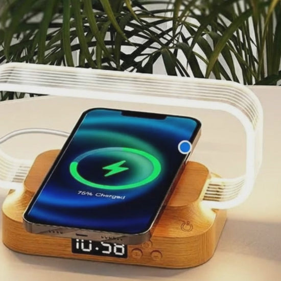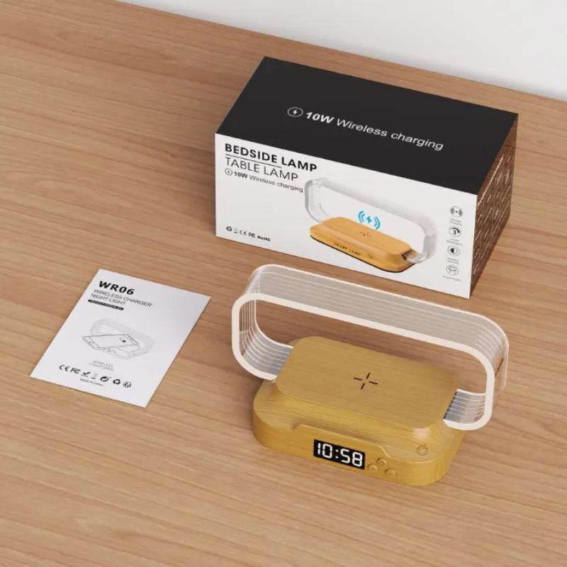 Upgrade your bedside or workspace with this sleek and modern multifunctional lamp. Combining a digital clock, night light, and wireless fast charging pad in one compact design, it’s the perfect mix of convenience and style for any room.